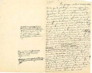 Ernest RENAN (1823-1892). Manuscrit autographe ; 1 page et quart in-8. Sur l’idée de nation. Brouillon très raturé et corrigé, avec additions sur la page en regard d’une allocution. Il a presque autant insisté « sur ce que la philologie...