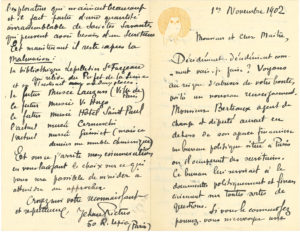 Jehan RICTUS (1867-1933). L.A.S., 1er novembre 1902, à un « cher Maître » ; 4 pages in-8 (vignette à la chouette). Rictus cherche une place de secrétaire et demande la protection de son correspondant, et des recommandations auprès d’un...