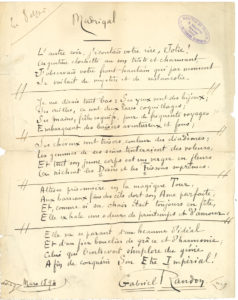 Jehan RICTUS. Poème autographe signé, Madrigal, mars 1892 ; 1 page in-4 (légères fentes marginales). Charmant poème de 5 quatrains ; le manuscrit est préparé pour l’impression et porte le cachet encre du Mercure de France.