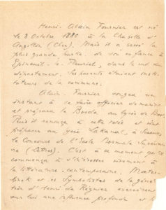 La notice biobibliographique sur « Henri-Alain Fournier », né en 1886, évoque les origines de ce fils d’instituteurs, sa jeunesse à Épineuil-le-Fleuriel, son éducation, et les premières influences littéraires exercées sur lui : Maeterlinck, les symbolistes de la génération d’Henri de Régnier. Rivière donne des précisions sur sa collaboration à Paris-Journal, et ses principales publications en revue, 1907-1911. « Mais la principale préoccupation d’Alain-Fournier restait son roman : Le Grand Meaulnes qu’il mit plusieurs années à composer. Il l’avait d’abord conçu comme une sorte d’ample poème en prose. Il voulait évoquer simplement, par allusions, à la façon des Symbolistes, le Pays merveilleux, qui hantait depuis toujours ses rêves. Puis il se décida à y faire accéder son héros pas à pas et agença la merveilleuse péripétie qui conduit Meaulnes au Domaine des Sablonnières. Ce fut ainsi que le livre prit peu à peu la forme d’un roman d’aventures. […] Au moment de la Guerre Alain-Fournier travaillait à un nouveau roman : Colombe Blanchet et à une pièce, dont il ne reste malheureusement que des esquisses assez peu poussées »… Suivent des renseignements sur son engagement comme lieutenant, en août 1914, sa participation à la bataille de la Marne, et la reconnaissance funeste dans les bois des Hauts-de-Meuse, le 22 septembre : « Après avoir franchi la trop fameuse tranchée de Calonne, sa compagnie tomba dans une embuscade et fut terriblement décimée. Les trois officiers restèrent sur le terrain. Longtemps on crut qu’Alain-Fournier n’avait été que blessé, et qu’il avait été recueilli par les Allemands. Cet espoir hélas ! était vain. Tous les témoignages réunis ces derniers temps confirment qu’il a été tué sur le coup. Il avait vingt-huit ans »…