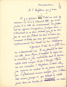 Maurice ROSTAND. Manuscrit autographe signé, Édouard VIII, juin 1937-juin 1947 ; 61 pages in-4 ou petit in-4 écrites au recto à l’encre violette, avec ratures et corrections, sous chemise a.s. Éloge écrit quelques mois après l’abdication...