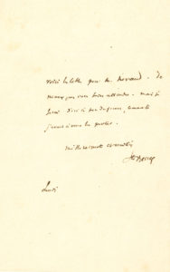 Charles-Augustin Sainte-beuve. L.A.S., Lundi [22 ou 29 mars 1841 ?, à George Sand] ; demi-page in-8. « Voici la lettre pour M. Néraud. Je ne veux pas vous faire attendre. [...] Mille respets et amitiés »...