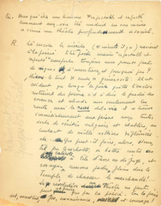 Être un poète même “respectable et respecté” comporte toujours une grande part de risques, d’aventures, et pourquoi pas ? […] de générosité ». Mais quand le poète quitte son jardin de poésie pour aborder « les rues de la vie il se trouve immédiatement aux prises avec toutes sortes de vérités vulgaires et établies », et il doit se battre comme Don Quichotte ou Jésus chassant les marchands : « La révolution au Théâtre ne peut se faire que par la poésie. Car la poésie est, avant tout, jeu, connaissance, et courage ! » En marge, Gabriel Pomerand a noté au crayon : « manuscrit de Georges Schehadé ».