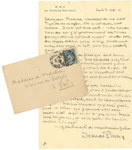 Jean de TINAN. L.A.S., Paris 3 octobre 1898, à Mme J.M. de Heredia ; 1 page in-8, enveloppe. Émouvante lettre de la fin de sa vie (il mourra le 18 novembre). Il remercie Tigre [de Régnier] de son envoi de dragées… « Vous avez aussi des...