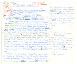 Elsa TRIOLET (1896-1970). 2 manuscrits autographes signés, [1963-1964] ; 6 et 8 pages in-4, avec ratures et corrections. Deux chroniques de critique théâtrale pour Les Lettres françaises.