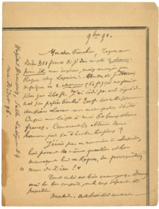 Elle non insérées, mais envoyées par Roques chez Lasnier. Au cas où je devrais défalquer ces 2 chansons (50 fr.) ça ne ferait plus que 260 fr. ». Comme il doit de l’argent au patron de son hôtel, il ne lui restera que « 60 beaux et bons francs. Comment les obtenir d’un homme qui se dérobe toujours ? J’écris par ce courrier à Lasnier [...] et le menaçant lui ou Roques, de poursuites “nom de Dieu” ! »... Il prie Ponchon de lui donner « le coup d’épaule possible », et il ajoute : « Malade. A l’hopital encore »...