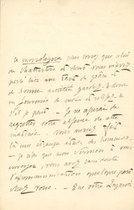 hier soir avec tant de grâce et de bonne amitié gardez-le donc en souvenir de moi et relisez-le s’il se peut. – Je ne cesserai de regretter votre absence de cette matinée. Vous auriez fait là une étrange étude des hommes. – Je n’ai que mon sermon à vous envoyer, vous avez sans doute l’excommunication quelque part chez vous. – Que votre Loyauté était charmante hier dans sa révolte pour moi ! Je vous en remercie du fond de ce cœur qui n’oublia jamais un sourire : – et n’accorda jamais le pardon d’une offense » [Vigny cite ici un vers du poème Magdeleine (1822) de la jeune Delphine Gay]…