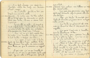 Montluçon, Compiègne, Avignon, Vierzon, Saint-Priest, Tours, Savonnières, Limoges, Angoulême, Saint-Jean d’Angély, Saintes, Cognac, Bagnères de Bigorre, Lourdes, Varenne sur Allier. Ce cahier, suite d’un n° 1 manquant, va du 24 mars au 23 août 1940. Nous en donnerons de brefs extraits. 11 avril. « Le capitaine et 3 hommes d’équipage allant convoyer un Bloch 210 se sont carbonisés dans un atterrissage forcé après le décollage ». 14 avril. « Pendant ma permission la plupart des avions Bloch sont partis. Des Potez 633 sont venus compléter la formation car les Bréguets se démolissent assez facilement… le Bréguet est assez bien armé mais le Potez ne l’est guère ». 11 mai. Bombardement : « nous entendimes des sifflements dont le bruit nous remplit d’horreur et presque aussitôt le bruit des bombes explosant. Tout tremblait dans un vacarme épouvantable. Je m’étais jeté dans le couloir et m’étais couché, je me relevai aussitôt après l’éclatement pour gagner l’extérieur, mais de nouveaux sifflements me firent me jeter sous les lavabos et pendant quelques secondes ce fut un tonnerre indescriptible. Parmi la poussière, les débris, des hommes jonches le sol. Je passai les premiers abris avec tant d’autres fuyant et couru m’abriter sous une haie d’arbres à 500 m de la caserne en passant à travers champs, marécage ou j’avais de l’eau et de la boue jusqu’au ventre »… 14 juin. Exode… Etc.