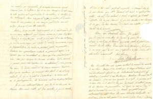 déchirure par bris de cachet affectant quelques fins de lignes). Jolie lettre qui laisse percevoir la personnalité et le caractère du jeune aspirant de marine. Il exprime toute sa joie et son émotion d’avoir reçu une lettre d’elle, et se résigne à accepter de n’entretenir qu’une relation amicale ; cependant ses pensées sont sans cesse tournées vers elle. Il lui parle de son écriture et de son style, puis répond à ses conseils. « Louise, tu me conseilles d’aller en société et de voir du monde ; je ne m’en soucie nullement pour diverses raisons que je puis t’expliquer. D’abord je ne m’y plais pas, ensuite je suis jeune et ne suis qu’aspirant, je ne dois encore songer qu’à acquérir de nouvelles connaissances, ce que la fréquentation du monde ne pourrait guerres me permettre. D’ailleurs mes appointemens actuels ne pourraient suffire à la dépense […]. Une fois enseigne de vaisseau et même contre-amiral, je pourrai faire cette dépense là ; en attendant je m’en passerois très bien. Tu désires savoir si la danse m’amuse ; tant s’en faut qu’au contraire cela m’ennuye très fort, et cela est assez naturel, je n’y ai ni goût ni dispositions, la raison seule me la fait apprendre, la bienséance seule me la fera pratiquer ». Il évoque ensuite le voyage de Louise à Bayeux et le « caractère si gai, si aimable et d’un si bon cœur » de son oncle l’abbé [qui se chargea de l’éducation de Dumont d’Urville à la mort de son père]. Enfin, dans un postscriptum, il donne, non sans une pointe de jalousie et d’amertume, des nouvelles de l’ami de Louise, Benerais, embarqué avec lui. « De son côté, il n’attend pas que tu lui choisisses ta procuratrice, car depuis un mois ou deux, il fait assidument la cour à une Beauté, qui paraît occuper entièrement ses affections. Du moins tel est le bruit public, car pour moi, je ne me mêle guère de ses amours, à peine connais-je sa Dulcinée »...