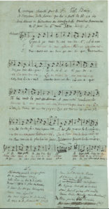 manuscrit de Valentin Hauÿ, intitulé : « Cantique chanté par le F∴ Val∴ Haüy, à l’occasion de la faveur que lui a faite la R∴ des amis réunis en l’admettant au nombre de ses membres honoraires, ce 4e jour du 6e mois de l’an 5810 de la V∴ L∴ ». Manuscrit musical de 35 mesures, notées sur une portée, avec paroles au-dessous de 3 couplets, plus 3 couplets ajoutés au bas de la feuille et au verso (ces derniers avec ratures et corrections) ; « Grâce à jamais te soit rendue, Alexandre, par tout Maçon ! De la félicité perdue Tu lui rend la possession, A peine entré dans la carrière, ses travaux furent suspendus. Tu lui fais revoir la lumière [...] Venu de l’orient de France / A l’orient de la Neva / Je ne dois qu’à leur seule indulgence / Ces bijoux dont elle m’orna »… Très rare manuscrit maçonnique et musical de Valentin Haüy (on sait l’influence qu’exerça la musique sur lui, et son importance dans sa pédagogie). En 1806, il était parti s’installer en Russie à l’appel du tsar Alexandre Ier afin d’y fonder une école pour les aveugles, qu’il devait diriger pendant onze ans.