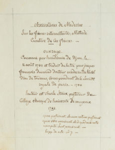demi-basane fauve avec pièce de titre veau rouge au dos (plats un peu épidermés). Traduction du latin par Jacques-François Dunand, « docteur médecin de l’Hôtel-Dieu de Tournus », d’Observationes medicinales de febribus intermittentibus et qua ratione eisdem medendum sit de Carl Strack, professeur du collège clinique de l’Université de Mayence, ouvrage couronné par l’Académie de Dijon, le 11 août 1782, et publié à Offenbach en 1785. Ces Observations sont précédées d’une « Épître de l’auteur à l’Académie des sciences, arts et belles-lettres de Dijon » dans laquelle Strack émet des réserves quant à l’usage systématique du quinquina : « je demeure convaincu de ne pouvoir mieux faire qu’en imitant les anciens médecins qui étaient privés de la ressource du quinquina, c’est-à-dire, que je suivrai modestement la nature plutôt que d’opposer indistinctement le spécifique à toute espèce de fièvre intermittente »…