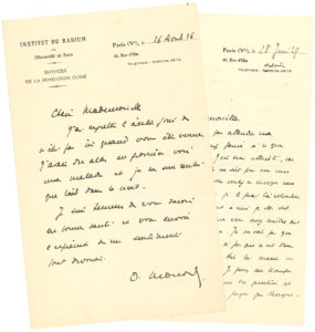 Octave MONOD (1877-1934) médecin de la Fondation Curie. 12 L.A.S., Lyon ou Paris 1919-1934, à Mlle Risse, institutrice puis directrice d’école primaire à Lapalisse (Allier) ; 16 pages formats divers, la plupart à en-tête Institut du Radium...