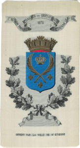 ORIENTALISTES. Image-souvenir en soie brodée, 1875 ; 24,5 x 13 cm. Armoiries de la ville de Saint-Étienne, surmontées d’un phylactère portant : « 1re Session provinciale Congrès des Orientalistes St Étienne 12-25 8bre 1875 ». Parfait état.