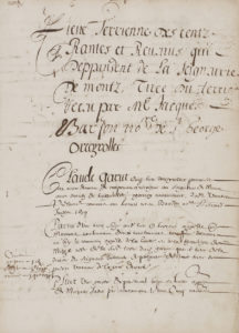 deppandent de la Seigneurie de Montz a été tirée du terrier reçu par Jacques Barjon notaire de Saint-Georges Orceyrolles. Beau terrier pour une vingtaine de lieux de la seigneurie de Montz ou Mons, en Auvergne. Le château fort de Montz (ou Mons), au Puy-en-Velay, échut en héritage à Marie-Isabeau Spert au milieu du XVIIe siècle ; fille unique, elle épousa Jacques-Hubert Pradier d’Angrain, lieutenant général en la sénéchaussée du Puy, dont le nom figure sur ces pages. Les dernières mises à jour marginales sont datées de 1783. Le registre s’ouvre par un « Reppertoire » des lieux, dont la plupart se situent dans le département actuel de la Haute-Loire, et quelques-uns dans le Puy-de-Dôme ou le Cantal : Orceyrolles, Theux, Mondolioux, Doulioux-Daurat, Antreulz (Antreuil), Bougernes, Craponne, Poupenac, Fraisse, Fraisse Marchadial, Longefont, Pinet, Montpeyroux, Saint-Georges [Lagricol], La Branchade, Arsac, Sassac, Besses...