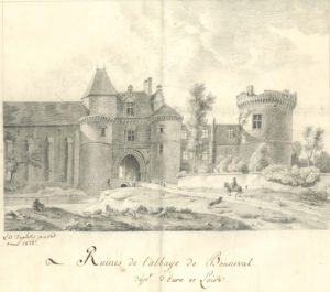 (1527), la Bartasse des Poiriers près d’Illiers (1550), Jehan de Rivière, coseigneur de Saint-Symphorien (1551), Robert de Galfart, seigneur de Marçay et du Trizay (1566), Israël de Rueil, sieur de la Gange-Manessière (1587), Robert de Prousier, Seigneur de Saint-Bonnet (1658) ; et les paroisses de la Chesnaye, Dangeau, Santilly-le-Vieux, Fresnay-l’Évêque, Chitenay, Auzainville, Saint-Lubin, etc. Contrat de mariage entre Aimé de Gastel et Suzanne de Temery, à la Framboisière (1662). Bref de Pie VI concernant le diocèse de Chartres (1786). On joint un dessin à la mine de plomb des ruines de l’abbaye de Bonneval par L. Duplessis (1822) ; et un petit lavis de l’intérieur de Saint-Valérien à Châteaudun ; plus une quinzaine de lois et décrets de la Révolution impr. dans le dép. d’Eure-et-Loir.