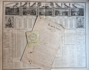 DIVERS. 9 lettres ou documents. L’Indicateur général 1836 édité par Binet (in-plano) avec 7 vignettes gravées « à la gloire de Napoléon ». Note financière sur carte à jouer. Manuscrit de La Sœur de Jocrisse, comédie en un acte de...