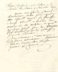 Prince s ont approuvé Monsieur, vos dispositions pour les officiers de votre regiment qui ne peuvent y rester, suivant le memoire qui leur a été addressé par Mgr le Prince de Condé a qui Mgr le Comte d’Artois vient d’ecrire en consequence pour quil en ordonnat le remplacement. Il n’est aucunement question de separer de votre Corps la Compagnie des hussards »... Puis Calonne parle de l’envoi de fonds...