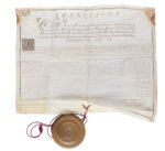 cm) pendant sur cordelettes rouges, dans son boîtier en buis tourné ; en latin. Acte solennel portant confirmation de tous les droits et privilèges octroyés en 1559 par Cosme Ier, à un ermitage sis sur les monts de Sienne : « Tenutam Eremi al Vivo », (Eremo del Vivo), en faveur de l’archevêque Alessandro Cervini (1695-1771). Parfait état, sauf deux rousseurs aux coins sup.