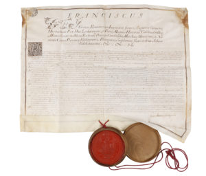 FRANÇOIS Ier (1708-1765) Empereur du Saint-Empire. Lettres patentes, signées par le Comte Emmanuel de Vihecourt, Tuscia 17 mars 1756 ; vélin in-plano (50 x 68 cm), avec en-tête et lettrine décorées, grand sceau de cire rouge aux armes (13,5...