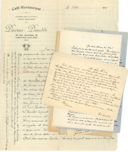 1916 ; 187 pages formats divers, une adresse sur carte postale Correspondance militaire, une enveloppe (un manque à une lettre). Intéressante correspondance de ce chercheur de l’Institut Pasteur, rattaché à l’ambulance de la 87e division d’infanterie territoriale comme aide-major. Les lettres sont écrites de Saint-Pol-sur-Mer, Blamertinghe, Ypres, Killem (Nord), Polincove, etc. La division opère en Belgique et dans le Nord de la France. « Je n’ai absolument rien à craindre », assure Tissier le 11 octobre 1914 ; il insiste sur la commodité de leurs installations, le courage des combattants, l’intérêt de leurs étapes, la supériorité des armes françaises, la distance entre l’ambulance et les premières lignes. Et de raconter gaiment de petits incidents de son service. « Leurs cadavres encombrent les tranchées et comme nos territoriaux ont pris leurs tranchées à la baïonette, on a jeté les cadavres par-dessus et comme on ne peut les enterrer on les arrose de chaux vive. C’est inouï ce qu’ils sacrifient des hommes ! Nous perdons deux fois moins qu’eux. Nos armes semblent plus meurtrières. Les leurs blessent mais tuent moins » (30 octobre 1914)… Observations et anecdotes sur l’équipement de l’ennemi, les différences entre les ambulances, ce qu’on sait ou entend dire du Kaiser, les mauvaises langues qui voudraient transformer l’admirable retraite de la Marne en une déroute, qui accusent les troupes du Midi d’être lâches, et les épouses des poilus d’être infidèles… Début février 1915, il semble que l’ennemi économise ses projectiles : « 25 blessés en 8 jours, quelle misère au lieu des 1000 par semaine de novembre »… Les Allemands auraient déjà perdu deux millions et demi d’hommes… Etc.