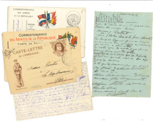 correspondance d’un infirmier, des tranchées aux Balkans. Les lettres concernent divers secteurs postaux (13, 51, 167, 171), les dernières du S.P. 514 (Balkans). Cycliste du médecin major du 43e Régiment d’infanterie coloniale, Courtois relate sa vie quotidienne ainsi que les événements militaires. Nous n’en donnerons que quelque brefs extraits. 1915. « Allons aux tranchées … sommes à 900m des tranchées et y montons ce soir ; on entend le canon, les obus, nous allons zigouiller quelques boches … des boches nous arrosent continuellement de rafale … le toit de la mairie est tout délabré et nous avons logé là dedans, si tu voyais ces maisons délabrées par les obus ça fait pitié , enfin c’est la guerre et on devenait pour ainsi dire sauvages, on se sent animé d’une haine féroce contre nos ennemis … j’arrive de la tranchée et nous y avons passé 4 jours et 4 nuits »… 1917. « On se trouve dans les Balkans, région de Monastir … violent bombardement tout un après-midi , il y a de la casse et je t’annonce la mort d’un camarade, un obus l’a surpris en plein sommeil dans une maison le tuant net, il avait une plaie perforante à la tête et à la poitrine dans la région du cœur ... ce soir à la tombée de la nuit le bataillon monte en ligne ... nous avons une grande tente carrée haute de 3 m et 20 m de long ... je porte un bonnet ou un képi à la place du casque, sur ordre formel on ne doit jamais quitter la grande ceinture de flanelle, on peut l’enlever le jour mais il faut la mettre en se couchant »...