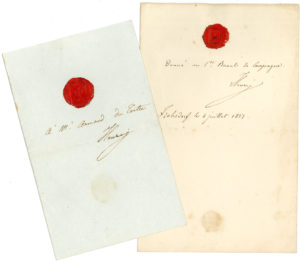 HENRI V, Duc de Bordeaux puis Comte de CHAMBORD (1820-1883) prétendant légitime au trône de France. 2 P.A.S. « Henry », Frohsdorf 4 juillet 1851 et s.d. ; demi-page in-8 avec sceau de cire rouge à ses armes chaque. Souvenirs à ses...