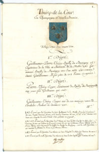 la famille Thiéry de La Cour en Champagne et dans le Barrois, avec armoiries peintes « D’Azur à trois Lions issants d’Or » : douze degrés depuis le XVe siècle. D’Hozier certifie que les deux derniers, Paul-André-Thomas et Joseph-André Thiéry de La Cour, respectivement Lieutenant-Colonel et cavalerie et son fils, Sous-Lieutenant au régiment de Noailles Dragons, « sont en droit de jouir des honneurs attribués à l’ancienne noblesse du Royaume »…