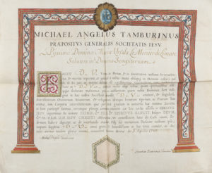 JÉSUITES. Michelangelo TAMBURINI (1648-1730) jésuite italien, Préposé général de la Compagnie de Jésus. P.S., Rome 5 avril 1707 ; vélin grand in-4 (36 x 43 cm) en partie gravé, grand décor d’encadrement aquarellé et doré avec vignette...