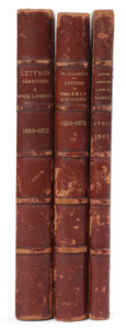 3 vol. petit in-4, demi-chagrin rouge. Un volume est constitué de 95 lettres adressées à Mme de Lagrené de 1833 à 1873 : sa fille Gabrielle, Thérèse Apponyi, Mme d’Arbouville, la baronne de Barante, E. Beulé, la Prince sse Czartoryski, Tanneguy. Duchâtel, Joseph Méry, Désiré Nisard, Pasquier, la duchesse de Périgord, la baronne de Rothschild, Salvandy, Mme Swetchine, Mme Thiers, le Duc de Valencia, Villemain, etc. Un volume rassemble 66 lettres par Mme C. Leman aux Lagrené (principalement à Madame), de 1836 à 1873. Correspondance très affectueuse, donnant des nouvelles de la vie parisienne (Lamennais, Balzac, mort de Charles X, Rachel, Marie d’Agoult, révolution de 1848, Lamartine, etc.) ; la dame passe ensuite la plupart de son temps en Lorraine, notamment à Cattenom... Un dernier volume recueille 46 lettres reçues par la Comtesse lors du décès de son mari en 1862 : L. Benckendorff, Marquise de Béthisy, Edm. Bussierre, Edward Lee Childe, Mme de Circourt, Émile Deschamps, Isabelle Gagarine, Sophie Galitzine, Ch. Giraud, la Reine Marie-Amélie, Nesselrode, Rambuteau, etc.