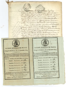 d’administrateur de la Loterie royale de France (27 sept. 1776). Imprimé à en-tête de la Loterie impériale de France : résultats du tirage de Bordeaux (22 sept. 1809). Loi relative aux Loteries (20 Janvier 1792). Prospectus de la seconde loterie de maisons, batimens et meubles nationaux (an III, 37 p. in-fol.). 3 billets de loterie de la Société des gens de lettres (1882). 3 séries de billets de tombola pour les Enfants tuberculeux ou débiles aux bains de mer (1904).