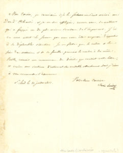 crise de folie du Général JUNOT, Duc d’Abrantès [relevé de ses fonctions de gouverneur des Provinces Illyriennes en juin, rapatrié chez son père, Junot se défenestra et se blessa grièvement ; mis à la retraite au lendemain de cette lettre, il mourut huit jours plus tard]. « Mon Cousin, je connaissais déjà le facheux accident arrivé au Duc d’Abrantès, et je me suis affligée, comme vous, du malheur qui a frappé un des plus anciens serviteurs de l’Empereur. J’ai vu avec interet le secours que vous vous êtes empressé d’apporter à sa déplorable situation. Je me flatte que le calme & les soins des medecins et de sa famille pourront le rendre à lui-même »…