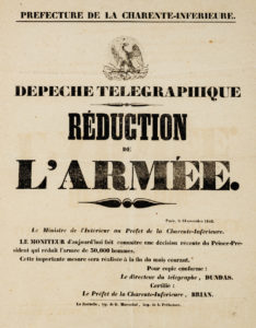 affiches de Bulletins de la Grande Armée (32-33e, et 37e, 1806) ; Arrêté relatif à la levée complémentaire faite sur les conscrits des dépôts des classes de 1806 à 1810 ; Proclamation de Louis XVIII aux Habitans de la Charente-Inférieure ; Avis de la Préfecture du Dépt du Tarn (28 nov. 1814) ; Cour des Pairs, Arrêt rendu le 11 avril 1831 contre les anciens ministres d’Haussez, Capelle et Montbel ; Ordonnance du Roi Louis-Philippe (14 déc. 1840) sur le recrutement ; Dépêche télégraphique, Réduction de l’Armée (Préf. de la Charente-Inférieure 18 nov. 1852) ; Arrêté du Ministère de la Guerre « portant fixation de la prestation individuelle que les militaires appelés sous les drapeaux auront à verser pour être admis, s’il y a lieu, à l’exonération du Service, pendant l’année 1856 » (28 déc. 1855) ; Décret Impérial et arrêté de M. le ministre de la Guerre relatifs aux engagements volontaires dans la Garde Impériale (12 mai 1860) ; Marine et Colonies, Avis. Engagements volontaires et Engagements après Libération pour les équipages de la Flotte (18 juil. 1861) ; 3 placards Société de secours Blessés militaires des Armées de Terre & de Mer (1866)… Recrutement, Volontariat (1873) ; Décrets Recrutement de l’Armée : classes de 1872, 1874, 1876, 1877 (tirages au sort)… On joint une gravure représentant le Combat de Montebello d’après Durand-Brager et Robert (supplément du Monde illustré 1859).