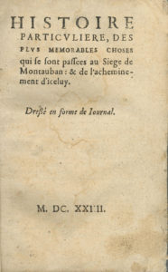 Siège de MONTAUBAN. [Hector JOLY]. Histoire particuliere, des plus memorables choses qui se sont passees au Siege de Montauban : & de l’acheminement d’iceluy. Dressé en forme de journal. S.l.n.n., 1624. In-12 (16,5 x 10 cm), 192 pages ;...