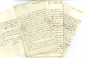 d’Arlincourt ; 194 pages in-8 ou in-4, tranches dorées, filigranes à l’effigie de Napoléon, quelques adresses. Très intéressante correspondance sur la Cour de Naples et le règne de Muratet sur l’éruption du Vésuve… Les lettres ont écrites durant les absences du baron d’Arlincourt, et donnent un vivant aperçu de la vie d’une famille d’officiers vivant dans le palais Acton, à Naples, sous le règne de Murat, et des événements qui la ponctuent : vie de la Cour, relations avec Caroline Bonaparte et Murat, éruption du Vésuve, trahison de Murat, etc. Nous ne citerons que 3 lettres, bien représentatives de cet ensemble. 6 septembre 1811, lors du voyage de Charles avec Caroline Bonaparte à Paris. « Je te l’avoue, mon cher Charles, la seule chose que je désire c’est que tu ne reviennes qu’avec la Reine, tu es partie avec elle, tu dois revenir avec elle [...]. Ma position ici n’est pas gaie, mais je suis consolée par l’idée que tu es auprès de la Reine, que tu peux lui être utile, et c’est pour moi beaucoup, que tu puisses lui montrer notre attachement ; tout mon désir est qu’elle me continue ses bontés et me fasse venir près de toi [...]. Le maréchal Pérignon est arrivé hier matin, il a été au désespoir de n’avoir point vu la Reine, tu sais combien il lui est attaché, il est toujours bon comme à son ordinaire. Le Roi l’a très bien reçu, comment serait-il possible d’accueillir mal un si brave homme ? [...] J’envoie à la Reine plusieurs éventails, il n’en reste plus que trois pour que tous ceux qu’elle m’a dit de faire faire soient terminés ; je lui ferai passer par une autre occasion, il y en a toujours. [...] Je ne puis trop te le répéter, c’est ta conduite à Paris qui peut tout faire sur notre avenir ; tu diras ma femme est une rabâcheuse, mais je te connais tu es si bon [...]. Caroline et Achillina [leurs filles] se portent à merveille ; Caroline est gentille à croquer, elle louche beaucoup moins depuis ton départ [...]. Dis à Mme Exelmans que son époux est l’exemple des maris, il ne pense qu’à elle, et c’est bien naturel, il est tous les soirs couché à onze heures, il ne va jamais au spectacle, il vient quelques fois nous voir le soir ; hier maman et moi nous avons été à la Villa Reale où il faisait un beau clair de lune, nous avons bien parlé d’Amélie. Le Roi la traite fort bien »... 28 décembre 1813, sur l’éruption du Vésuve. « Je te dirai que le Vésuve nous donne depuis deux jours un spectacle beau, mais vraiment effrayant ; le jour de Noël à six heures du soir, l’éruption a commencé, le vent de tramontane avait régné toute la journée et le Vésuve avait été couvert d’un nuage noir et épais ; lorsque la nuit est arrivée, ce nuage s’est changé en feu, et s’étendit par la force du vent à une hauteur prodigieuse ; ajoute à cela les détonations qui faisaient tout trembler ; cette belle horreur a duré environ deux heures, le vent s’est calmé, la lave coulait toujours mais sans fréquentes éruptions ; la nuit a été fort tranquille. Le lendemain, le tems était très beau lorsque je me suis levée ; j’ai déjeuné à dix heures et je me suis mise à lire ; il y avait à peu près une demie heure que je lisais lorsque je crus entendre un coup de canon, je me levai et j’allai sur ma terrasse pour savoir si ce n’était pas un bâtiment qui entrait dans le port ; il n’y avait rien ; mais en me retournant du côté du Vésuve, je vis dans le même moment s’élever un nuage qui s’étendit avec une telle rapidité qu’en un quart d’heure il est venu nous jeter des petites pierres jusqu’à Ste Lucie. Le beau soleil a été obscurci en entier, les détonations qui nous avaient paru fortes la veille n’étaient rien en comparaison de celles du lendemain ; les vitres du gai Domon ont été cassées et dans nôtre palais noms avons eu l’idée de ce que peut être un tremblement de terre. Je t’assure que c’était très effrayant et si cela eut duré un peu plus, tous les habitants de Portici et de la terre arrivaient à Naples. Le Roi a été obligé d’y aller pour calmer les esprits ; il n’y avait rien de plus singulier que de voir la route de Portici couverte de ces malheureux, qui portoient leurs chaudrons, leurs marmites, leurs couvertures, leurs matelas, et leurs enfants de l’autre côté »... 12 et 22 janvier 1814, après la trahison de Murat, qui s’est allié à l’Autriche : « le Roi a conservé son royaume en traitant avec les ennemis ; le Comte de Mier est arrivé hier soir et le maréchal Pérignon part dans vingt quatre heures. Je suis femme, mon ami, je n’ai donc d’autres conseils à te donner que de te dire, de lire ta patente. C’est ce que le maréchal a répondu aux personnes qui l’ont consulté. Je pensé qu’il est bien dur pour un bon français de se trouver en face des ennemis de son pays, et d’être presqu’obligé de les traiter en amis ; je dis presque car je te connais pour croire que tu ne démentiras jamais assez ton honneur. Fais ce que tu dois, advienne ce qu’il pourra, c’est bien là le cas de le dire. J’attends une réponse de toi pour me préparer à ce que je dois faire »... Elle espère « que S.M. le Roi allait te rappeler ici ; c’est une bonté du Roi de te rendre justice et de penser que tu ne pourrais sans te déshonorer porter les armes contre tes compatriotes. S.M. y a apparemment ses intérêts attachés et certes je suis loin de blâmer ce qu’elle fait, cela ne doit regarder personne, et elle doit être assez juste pour croire que nous faisons un grand sacrifice en la quittant »... Les dernières lettres de 1815 sont écrites de Capo di Monte, lorsque le baron était prisonnier des Autrichiens et incarcéré en Hongrie. On joint : 12 L.A.S. au baron, écrites de France durant son voyage à Bordeaux (1816), et 2 L.A.S. à sa mère (Naples, 1808-1809) ; plus une belle 