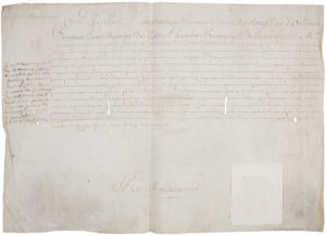 et avec apostille a.s. de Philippe-Alexandre, chevalier de Conflans ; vélin in-plano, sceau aux armes sous papier (petits trous et fentes). Provisions de l’une des six places de maître d’hôtel dans sa Maison en faveur de Victor-François Gaillard, sieur de La Menaudière et de Nanteuil, officier. « Les bons services que son pere et luy ont rendus en cette qualité a feue Monsieur le Duc d’Orleans notre très honoré pere nous donnant lieu de nous assurer que nous trouverons en luy toute la fidelité, affection et experience que nous pouvons desirer »…