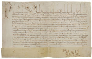 latin. Le Pape invite l’évêque de Perugia (Pérouse) à accorder une dispense en mariage à Hieronimus Rosate, laïc, et Marine Petri, du diocèse de Pérouse. Parmi la dizaine de signatures de chancellerie au bas du document, on relève celle de C. Pamphilius (Camillo Pamphili). On joint un bref du même, Rome à Saint-Pierre 19 décembre 1606 ; vélin oblong in-fol. (24,5 x 42,5 cm). Concession d’un autel privilégié, sous l’invocation de Saint Antoine, accordé au couvent des Carmélites de Calatayud, diocèse de Tarazona. Signature du futur Cardinal Scipione Cobelluzzi « Scipio Cobellutius » (1564-1626, il sera bibliothécaire du Vatican).