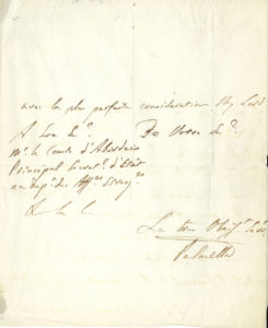 in-4 ; en français. « Sa Majesté la Reine de Portugal mon Auguste Souveraine venant de débarquer dans ce port, je m’empresse de faire part de cet evenement à Votre Excellence et de la prier d’accepter les remerciements de Sa Majesté tres fidelle, pour la reception distinguée, que, conformement aux ordres de Sa Majesté Britannique, lui ont fait les Autorités militaires et civiles de Falmouth ». Il doit remettre à sa Majesté une « lettre adressée par S.M. l’Empereur du Bresil, en sa qualité de tuteur de son Auguste fille la Reine de Portugal, à Sa Majesté le Roi votre Auguste Maître »…
