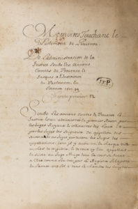 PROVENCE. Manuscrit, Memoires touchant le Parlement de Provence, [vers 1675] ; 442 pages in-fol., en un volume reliure ancienne parchemin (usagée, plat sup. refixé). Intéressant manuscrit sur le Parlement de Provence.D’une belle écriture...