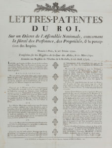 Lettres-Patentes du Roi (mars-avril 1790) sur la perception des impôts, la suppression de la Gabelle… ; Loi sur la contribution foncière ; Loi qui accorde une somme de quinze millions pour être employée à l’établissement d’Ateliers de Charité (19 déc. 1790) ; Loi relative aux pensions (25 fév. 1791) ; Loi Relative à la suppression des chambres des Comptes & à la nouvelle forme de Comptabilité (29 sept. 1791) ; Loi qui fixe les règles de comptabilité conformément au nouveau système des poids et mesures (17 floréal VII) ; Lois relatives aux Domaines Nationaux, aux rentes foncières, à l’administration des Hospices civils, au paiement des rentes et pensions, à la perception des droits d’hypothèque, à la taxe d’entretien des routes, à l’établissement d’une taxe sur le tabac, aux contraventions en matière de grande voierie, etc…