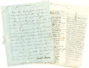 arrivée dans la colonie. Fils du Maréchal de Rochambeau, le vainqueur de Yorktown, Donatien avait servi pendant la guerre d’Indépendance américaine. À la fin de 1801, il fut nommé second du Général Leclerc pour l’expédition de Saint-Domingue. Après la mort de Leclerc atteint par la fièvre jaune, en novembre 1802, Rochambeau devint Capitaine-Général de la colonie. Battu par les troupes de Dessalines le 18 novembre 1803, il quitta Saint-Domingue et fut fait prisonnier par les Britanniques. Les lettres concernent des sujets divers : livraison de mouchoirs brodés commandés en Italie, recommandations pour un interprète qui doit se rendre au Cap, messe célébrée aux Vérettes près de Saint-Marc, réclamation d’une propriétaire, envoi de l’ouvrage de Guyton de Morveau sur la manière de désinfecter l’air lors des épidémies, méfiance envers un secrétaire qui semble avoir pris le parti des rebelles, recommandations pour une créole de l’Artibonite qui doit se rendre dans la colonie, contestation d’une prétendue succession Moyse, visite d’un ami à Vendôme chez son père, etc. La période couverte par cette correspondance s’étend du 20 vendémiaire X (12 octobre 1801) au 6 germinal XI (27 mars 1803). Citons quelques extraits. Antoine Adamini, négociant à Gênes : « vous devez aller à St Domingue. Si vous y connaissiez quelques négociants qui chargeassent des marchandises pour Gênes, vous m’obligeriez beaucoup de les adresser à ma maison »… Mme Tully : « Je vous adresse une lettre de Mad. Bonaparte pour le général Leclerc comme nous en sommes convenus pour faire avoir à Tilden la place d’interprète au Cap »… Vidaud (curé à Saint-Domingue) : « Je me suis rendu samedi dernier aux Vérettes et j’y ai officié hier dimanche, j’ai eu peu de cultivateurs à ma messe, malgré cela je les ai prêchés et tous m’ont promis de faire rentrer autant qu’il serait en leur pouvoir leurs camarades ; d’après ce que plusieurs m’ont dit, il paraît que très peu se risquent à passer de notre côté »… Castellane de Berghes, propriétaire : « Depuis le retour de l’ordre et de la justice, c’est cet espoir qui m’a déterminée à faire ce grand voyage. Je viens réclamer la remise de mon habitation située dans la plaine de Limonade »… Bernard Martin des Pallières, colon à Saint-Domingue et membre du Corps législatif : « Madame de Frédilly qui vous remettra la présente est une créole de l’Artibonite élevée en France. Elle jouissait autrefois d’une brillante existence, sa position est changée comme la nôtre, malgré cela elle n’aurait pas eu besoin d’aller à St Domingue sans le désir qu’elle a de revoir son frère »… Charles René Magon de Médine : « J’ai été à Rochambeau où le devoir de la reconnaissance m’appelait pour parler de vous avec le maréchal et Mesdames Rochambeau, le bien que vous aviez dit de moi m’a fait recevoir l’accueil qu’on eut fait à un fils »… Etc.