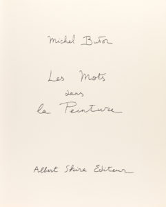 1969. LIBRO: .(ARTE). .BUTOR, MICHEL: .LES MOTS DANS LA PEINTURE. Gèneve: Éditions d´Art Albert Skira, 1969. 4º mayor. 182 + 1 h. Profus. ilustr.con imágenes en negro y sobrepuestas a color. En rama, presentado en una carpeta en medio pergamino...