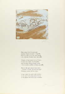 al final, contiene un aguafuerte con una composición poética, a excepción de la primera que contiene tres estados, los dos primeros sin el poema. Todas las lám. firmadas y numeradas por los artistas y escritores. La obra incluye las siguientes composiciones: I: .Nocturnàlia, de Brossa y Tàpies. II: .Pels jardins, de Brossa y Llimós. III: .Preservació, de Carner y Ràfols Casamada. IV: .Giorgio Morandi, de Comadira y Vives Campomar. V:. Promesse de bonheur, de Ferraté y Arranz-Bravo. VI: .Exeunt personae, de Ferrater y Bru. VII: .Sonet, de Gimferrer y Hernàndez Pijoan. VIII: .Boira, de Oliva y Vilà. Presentados en una carpeta editorial en tela, con una rozadura en el plano anterior. Tiraje de 95 ejemplares.