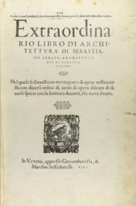 1561. LIBRO: (ARQUITECTURA). SERLIO, SEBASTIANO: EXTRAORDINARIO LIBRO DI ARCHITETTURA. Venetia: Appresso Giouambattista, & Marchio Sessa fratelli, 1561. Folio mayor. 6 h. (a6 traspuesta, pero completo) + XX lám. + XXV lám. grabadas al cobre. De la...