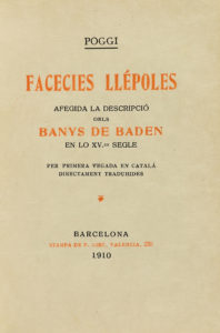 1910. MANUSCRITO: (BIBLIOFILIA). POGGI: FACECIES LLÉPOLES AFEGIDA LA DESCRIPCIÓ DELS BANYS DE BADEN. Barcelona: Stampa de F. Giró, 1910. 12 º. Xilografía + 95 p. Portada a dos tintas. Cabeceras en rojo. Rústica original. Ejemplar del tiraje de...