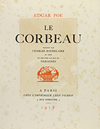 1918. LIBRO: (BIBLIOFILIA). POE, EDGAR; DARAGNÈS (ilustr.): LE COURBEAU. Trad. Charles Baudelaire, 1918. 4º menor. 14 p. Ilustr. con xilografías en el texto por Daragnès. Abundante señal de óxido. Rústica. Edición numerada de 371 ejemplares.