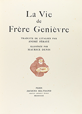 1923. LIBRO: (BIBLIOFILIA). DENIS, MAURICE (ilustr.): LA VIDE DE FRÈRE GENIÈVRE. Trad. del italiano por André Pératé. Paris: Jacques Beltrand, 1923. 2 b. + 6 h. + 26 p. + 5 h. Ilustr. con grabados de Maurice Denis. Puntos de óxido. En rama,...