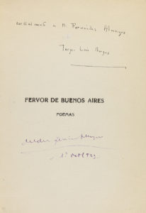biblioteca, en la portada y primera hoja. Sin las cubiertas originales. Primera edición de extraordinaria rareza. EJEMPLAR ÚNICO CON DEDICATORIA AUTÓGRAFA DE BORGES, fechado y con firma de su poseedor a quien Borges dedicó, ´Melchor Fernández Almagro / 1º de oct. 1923´. El personaje a quien Borges destinó este ejemplar era Melchor Fernández Almagro, ilustre y conocido historiador y periodista español de la primera mitad del s.XX. Para la bibliografía de esta importante obra poética, véase el magnífico trabajo de Carlos García, La edición princeps de Fervor de Buenos Aires, Variaciones Borges 4 (1997). Becco 3.