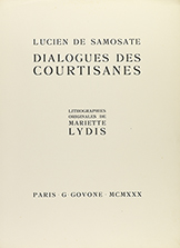 1930. LIBRO: (BIBLIOFILIA). SAMOSATE, LUCIEN DE: DIALOGUES DES COURTISANES. Paris: G. Govone, 1930. Folio mayor. Contienen 12 diáglogos con 12 litografías de Mariette Lydis firmadas por la artista. Papel de la ilustración X tostada. En rama,...