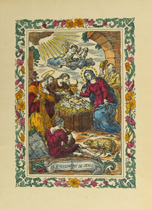 1945 ca. LIBRO: (BIBLIOFILIA). AMADES, JOAN: EL PESSEBRE. Barcelona: Les Belles edicions, s.a. Folio mayor. 375 p., 1 h. Ilustr. en texto y 4 láminas, cabeceras y capitales coloreadas a mano. Enc. en tela edit. con lomera y plano anterior estampado,...