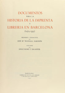 1955. LIBRO: (BIBLIOGRAFIA). MADURELL, JOSÉ M.; RUBIÓ Y BALAGUER, JORGE: DOCUMENTOS PARA LA HISTORIA DE LA IMPRENTA Y LA LIBRERÍA EN BARCELONA (1474-1553). Recogidos y transcritos por José Mª Madurell Marimón. Anotados por Jorge Rubió y...